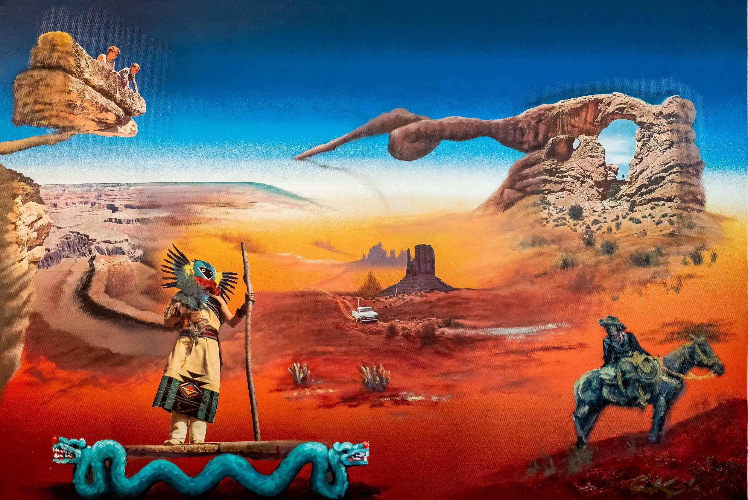 “The Southwest Series explores the mix of past cultures that came before us, highlighting the vibrant colors and awe inspiring scenery that fill the landscapes of the American Southwest. Balancing indigenous people with those that eventually reigned, these pieces ultimately pay tribute to the beauty of the land beyond the politics and violence that we now can not control in our current time; Playfully yet delicately balancing the tightrope of the “Cowboys vs. Indians” trope.” -Cade